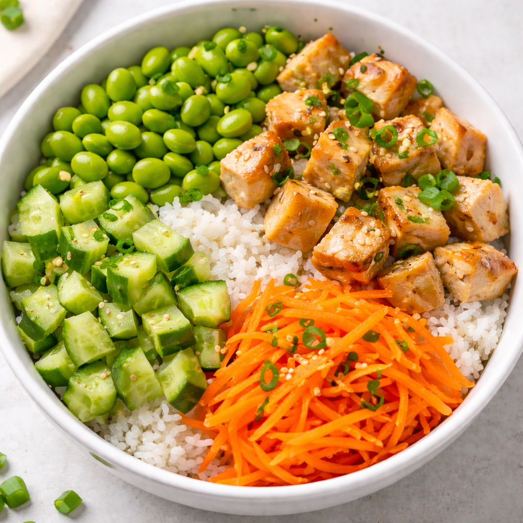 White Rice, Soy Sauce, Chicken Breast, Rice Vinegar, Honey, Orange juice, Sesame Oil, Garlic, Ginger root, Soy Sauce, Honey, Cucumber, Carrots, Edamame, Green Onions, Sesame Seeds