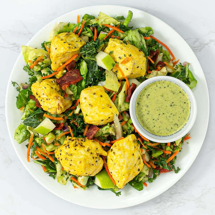 Broccoli, baby spinach, carrot, Granny Smith apple, turkey uncured bacon (turkey, water, vinegar, sea salt, raw sugar, celery powder), lemon juice, apple juice, cashews, olive oil, Italian parsley, agave, green onion, black ground pepper, salt, fresh tarragon, lemon, spring mix lettuce, kale, pecan pieces, shallot, lemon pepper, D’Artagnan air-chilled chicken thighs, grapeseed oil, baby arugula.
