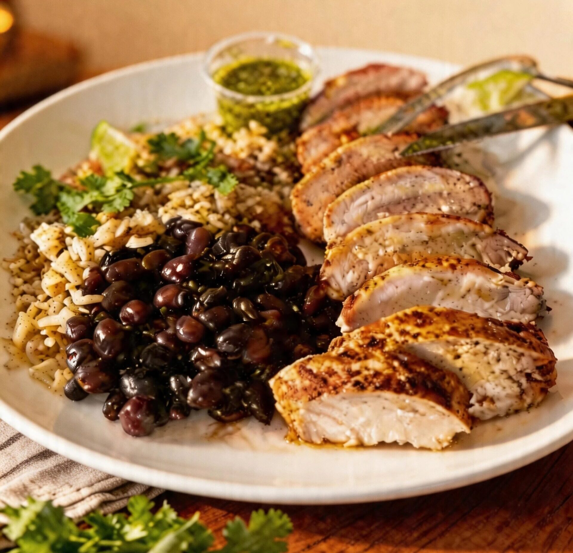 A Lean and Delicious Grilled Chicken w/Brown Rice and Black Beans served with ourMojo Green Sauce.
