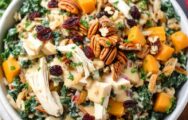 Butternut squash, yellow jumbo onion, brown rice, crimini mushrooms, apple juice, egg, celery, Yukon Gold potato, green cabbage, kale, tomato paste, olive oil, pumpkin seeds, carrot, green bell pepper, red bell pepper, almond flour, Dijon mustard, coconut flour, agave, rolled oats, salt, black ground pepper, Italian parsley, ground rosemary, nutritional yeast, fresh ginger, ground cinnamon, ground thyme, ground 93/7 antibiotic-free turkey, cauliflower rice, cranberries, shallot, mascarpone cheese (cow’s milk and cream, citric acid), pecorino cheese (sheep’s milk [pasteurized], cultures, rennet, salt), peeled garlic, sherry wine, orange zest, and granulated garlic.