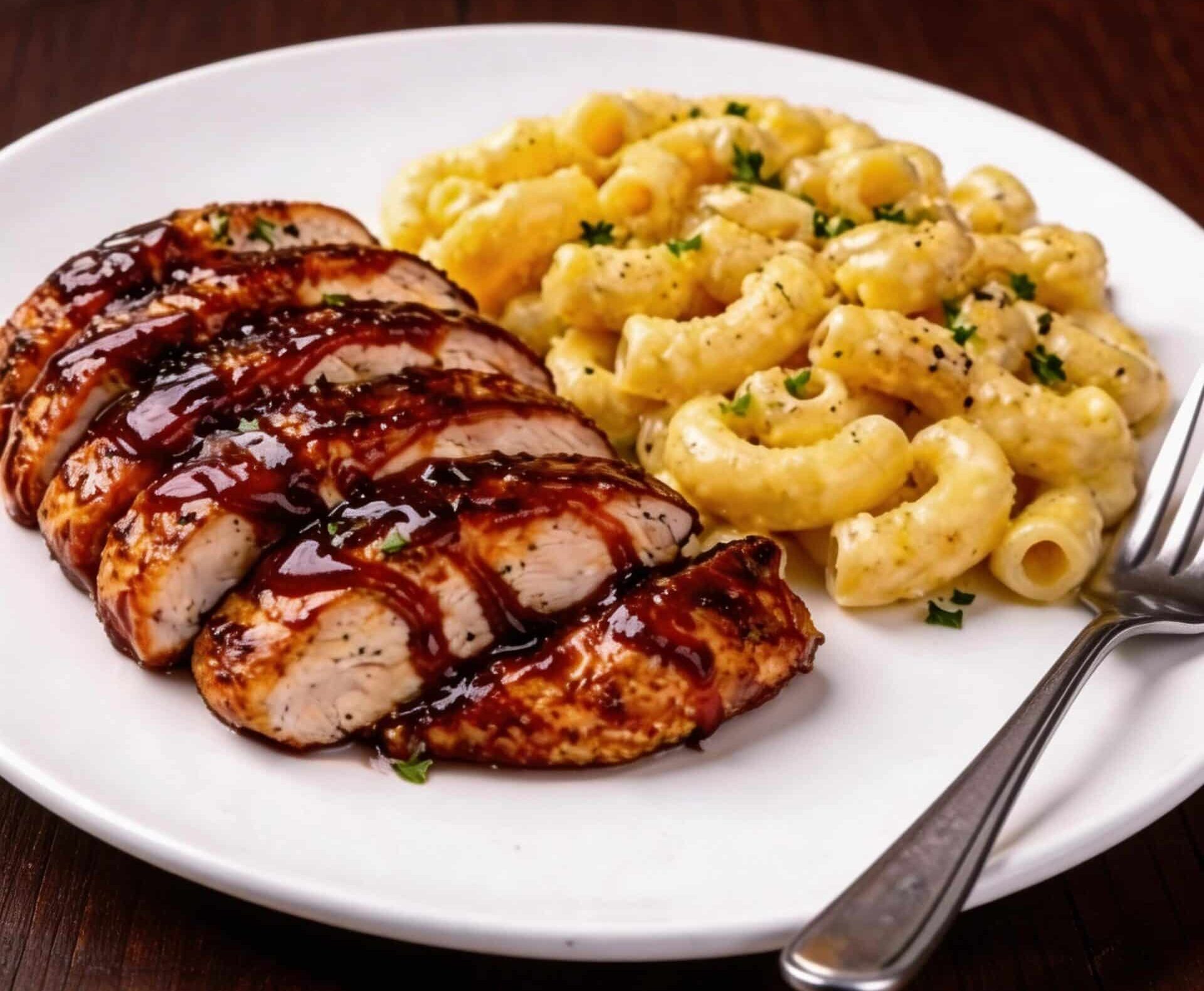 Chicken Breast, Macaroni and Cheese 5 oz, White Sauce, Elbow Macaroni, dry, Reduced Sharp Cheddar, Fat Free Cheddar, Yogurt Butter, All-Purpose Flour, Salt, BBQ Sauce, Peppers, Serrano, Raw, Coriander leaves, Sriracha Sauce, Hoisin Sauce, Green Onions, Ginger root, Garlic, Oyster Sauce