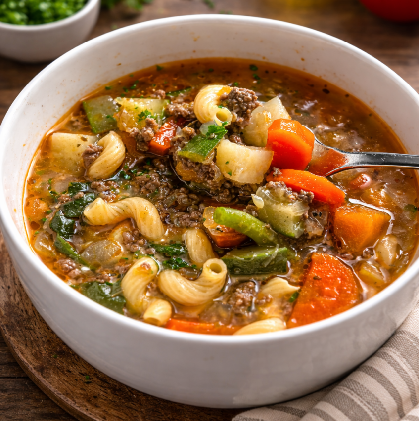 Beef broth, Springerhill 98% Extra Lean Sirloin, Water, Butternut Squash, Onions, Zucchini Summer Squash, Carrots, Spinach, Potato, Chickpea Pasta, Salt, Garlic Cloves, Italian Seasoning, Black Pepper, Smoked Paprika